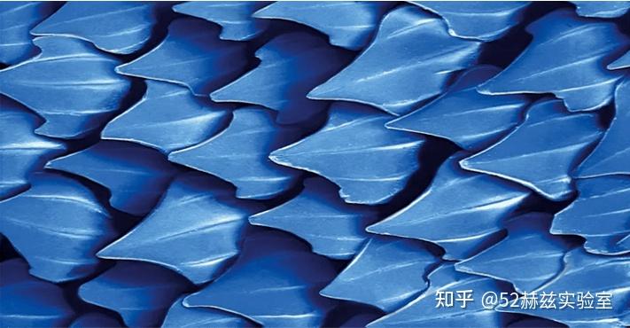 “鲨鱼皮”表面的微观结构具有减阻特性,这是因为鲨鱼皮表面有很多小颗粒和细小的皮瓣,这些皮瓣形成了一种类似于三角形的结构,可以使水流向一个方向流动,减少水流的摩擦阻力。