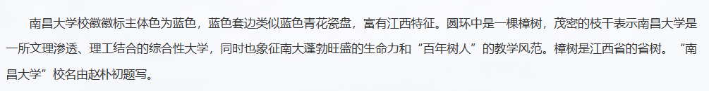 南昌大学 南昌大学校徽那会正好在追《龙族》,第一眼我还以为是卡塞尔学院校徽中的世界树,当时真的被震惊到。 后面上官网查了,图中的树是樟树,是江西省的省树,蓝色的套边是有江西特征的蓝色青花瓷盘元素,不过这寓意还是蛮不错的。而且作为江西全省唯一的211,用"树"这个形象,又是省树,真的的江西省的顶梁柱了。希望江西省其余各高校都能发展起来,评一所双一流也好啊 https://www.ncu.edu.cn/xxgk/xxxh.htm 送礼物 还没有人送礼物,鼓励一下作者吧 编辑于 2024-05-23 20:39・广东 赞同 35576 条评论分享 收藏喜欢 收起