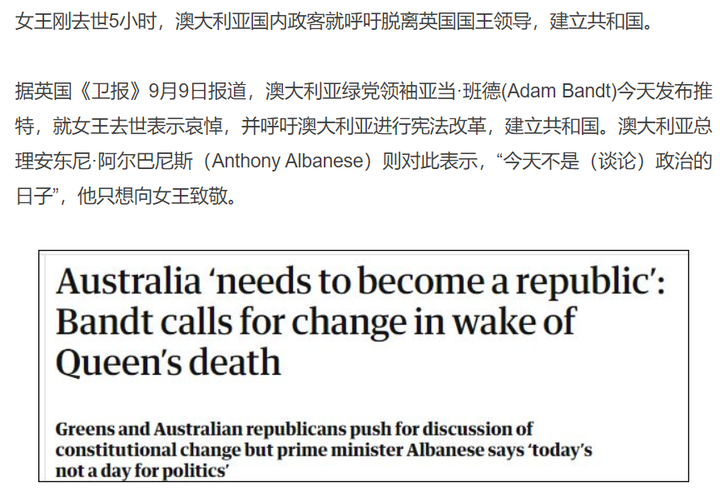 我也不会现在就下断言说什么“老女王没了,英国要完蛋了”。不过澳大利亚绿党在得知老女王去世5个小时之后就放话说要成立共和国。