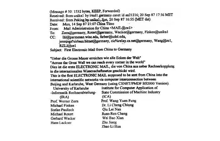 3、也是最为讽刺的。中国向世界发的第一篇电子邮件