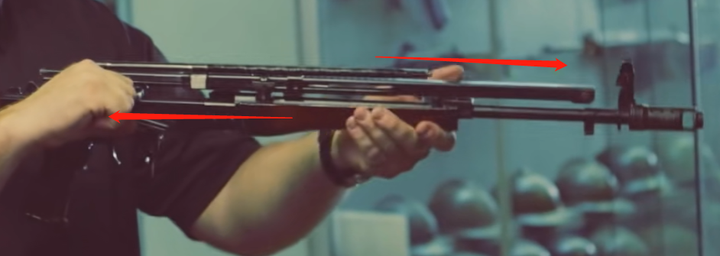 AEK971结构及原理模拟后座 反冲块向前运动 利用机械联动让枪械的后座动能转成向前的动能,大量消减了后坐力。