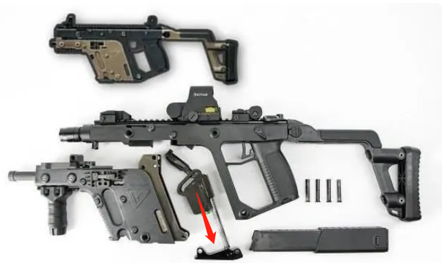 维克多结构 维克多短剑利用这个小滑块沿着滑轨向下运动,将本来向后的后坐力动能导向斜下,同时配合低于握持手的枪口,将后坐力消减的几乎不见。