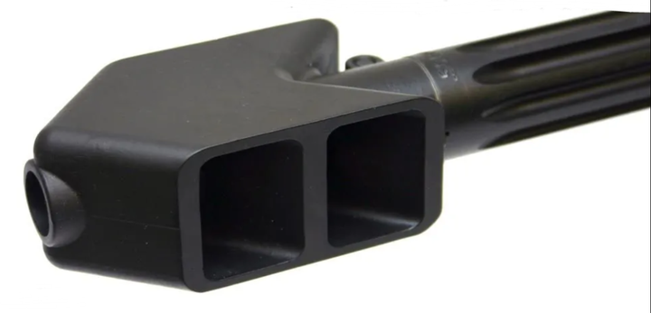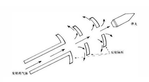 气体就是这样被挡住一部分,并在结构的引导下转向,向侧后喷射,给枪支一个向前的反冲的力,抵消一部分后坐力。