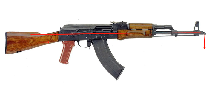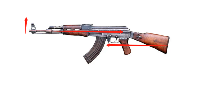 AK47 可以看到初代AK47的设计上,枪管延长线,也就是后坐力延长线,和抵肩的位置并不在同一高度,这种高度上的落差产生了一个向上的扭矩,这也是AK47上跳严重的原因。