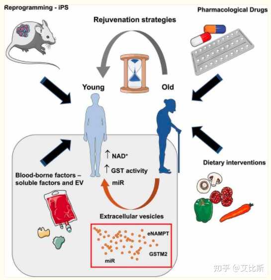 所以延缓衰老就是阻止或逆转上述特征的发生,延缓衰老的策略大致分为:1、系统因子(systemic factors);2、代谢调控;3、衰老细胞消融;4、细胞重编程。