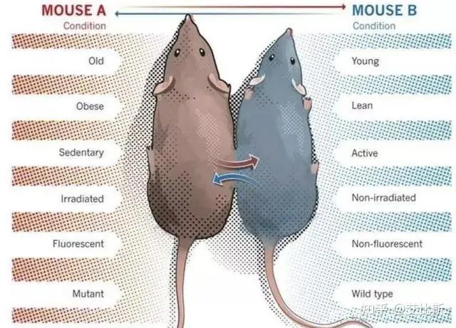 在系统因子中,血液对衰老的影响报道较多,证据也比较充分。异种共生研究(Heterochronic parabiosis)是通过手术方式将两只小鼠的循环系统进行连接,研究人员发现年轻小鼠的血液会促进年老小鼠恢复活力异,包括肌肉干细胞活力、肝脏、大脑和心脏功能,减少老年小鼠的基因组不稳定性。同时将年轻小鼠血浆注射到年老小鼠体内,也可以改善年老小鼠活力。【1-3】