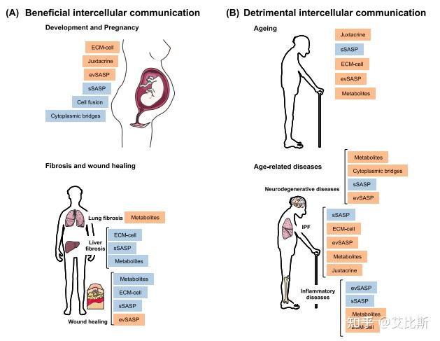 细胞间通信是指细胞之间相互通信和传递各种信息的不同方式。细胞间通讯的最佳特征是释放影响邻近细胞功能的可溶性因子。衰老细胞同样也会释放可溶性分子影响周围细胞。与衰老相关的还有分泌性炎症因子统称为SASP(senescence-associated secretoryphenotype)。