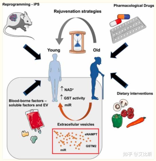 除了血液外,细胞外囊泡(EV)是一种受膜保护的囊泡,含有多种蛋白质、核酸、脂质和代谢物,可以介导衰老的恢复【4】。EV可以按来源分类,可以是内吞的,也可以是直接由质膜形成的,大小在50到150纳米之间的称为小细胞外囊泡(sEV)
