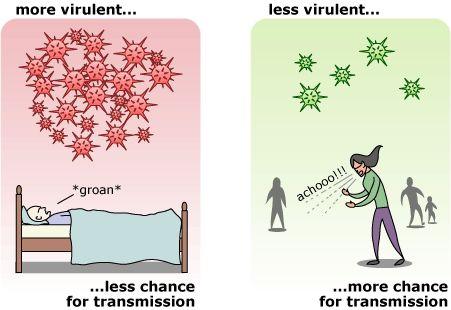 图2:毒力与传播率的权衡关系:过高的毒力导致感染者无法接触新的潜在宿主,限制了其传播能力;而毒力适中的病毒虽然产生较少的病毒,但因其宿主活动性不受限,可以感染更多新宿主,从而获得更高的适应性。[2]