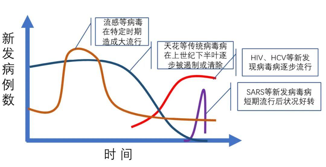 历史地来看,病毒传播具有时代特征。在早期的城市化进程中,人员聚集,公共卫生状况恶化,给呼吸道传播(流感)、消化道传播(脊髓灰质炎、甲型肝炎)、载体传播(城市鼠患、跳蚤等体外寄生虫)创造了条件。而在大航海时代,传染病可跨洋传播,给原住民造成极大的伤害。卫生条件伴随着经济发展而逐渐改善后,大量公共卫生相关的传染病传播就相应受到很大的遏制。但新时代也产生了新的问题:环境破坏引起新发病毒病和再发病毒病,国际间频繁交流加速传染病流行,艾滋病持续肆虐,耐药毒株出现……