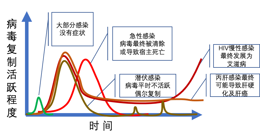 图1:病毒感染后果并不相同,大部分感染不导致疾病。部分急性感染或慢性感染可导致严重疾病。丨作者供图