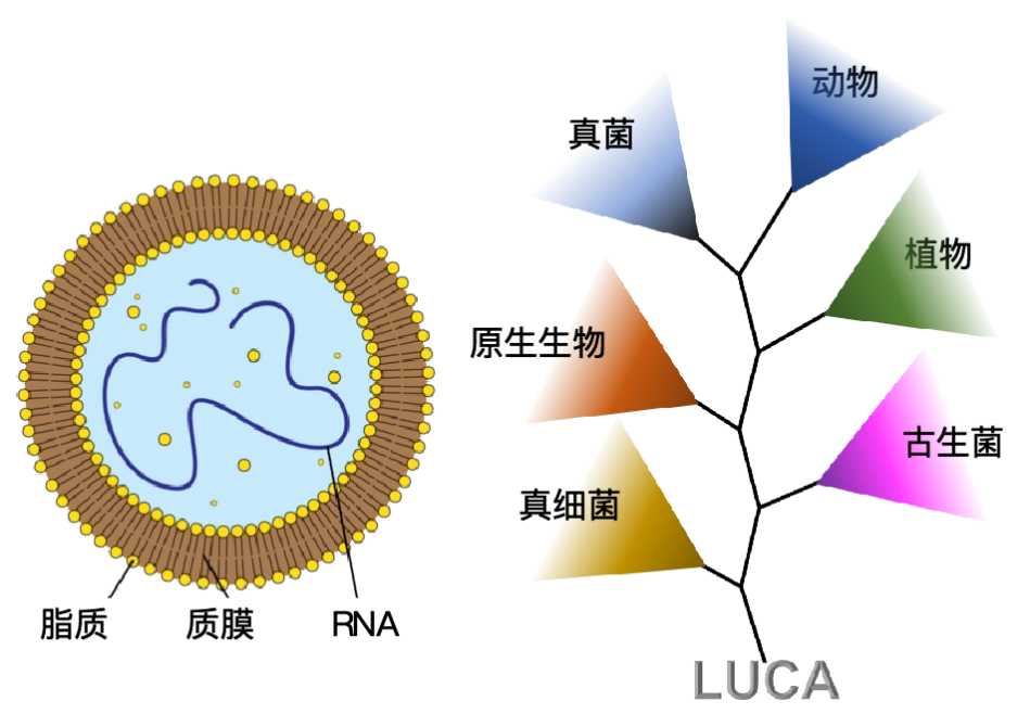 盘古开天地是打破“状如鸡子”的原始宇宙(鸡子是指鸡蛋),而生命的产生却要形成“鸡子”——质膜包裹的原始细胞结构。质膜的产生使原始生命自成体系,产生了“我”与“非我”的区隔。大约 35 亿年前,有这么一类细胞通过繁殖,产生新个体“你”,演化产生新物种“他”,于是“大家”就都产生了。这类细胞就是“露卡”(Last Universal Common Ancestor,LUCA),所有细胞生物的共同祖先。露卡的后代们都可以根据演化关系编排到统一的演化树上。