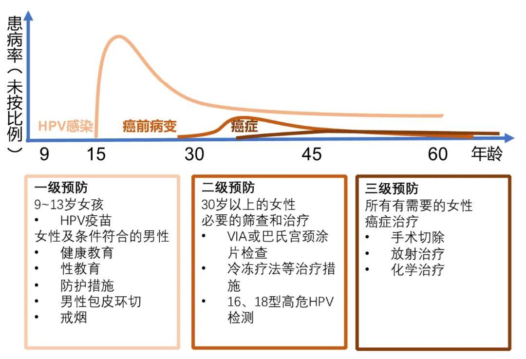 图4:以宫颈癌的三级预防为例。HPV感染高峰期发生于性活跃期,大多数感染被自发清除,部分感染后三到五年后造成病变,病变持续恶化可能会导致宫颈癌。疫苗注射(一级预防)和病理筛查(二级预防)是预防宫颈癌的重要手段,并应当通过检测发现癌前病变或早期宫颈癌,并及时治疗(三级预防)。一级预防和四级预防未名列,但应贯穿始终。丨作者参考WHO资料制图