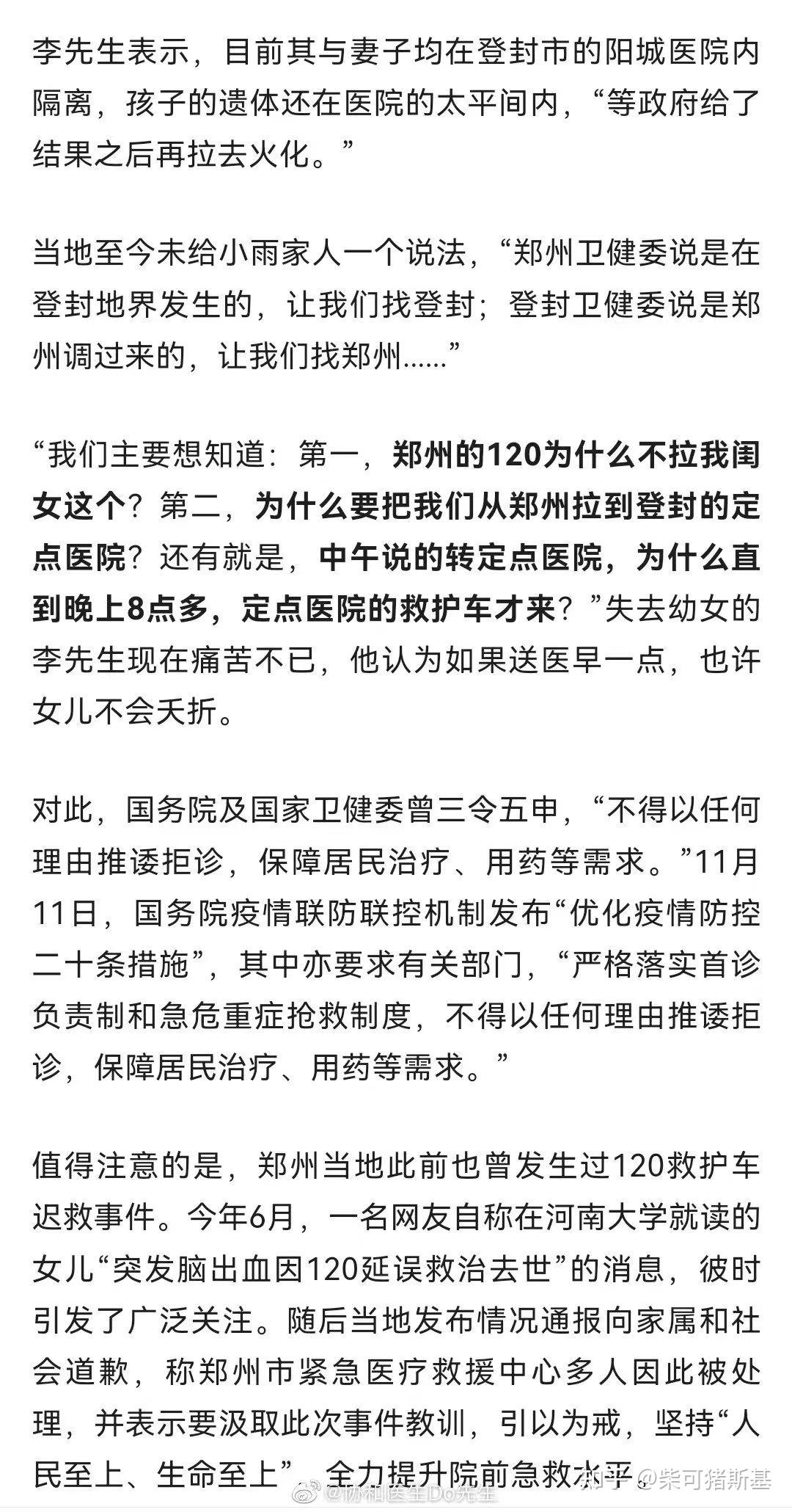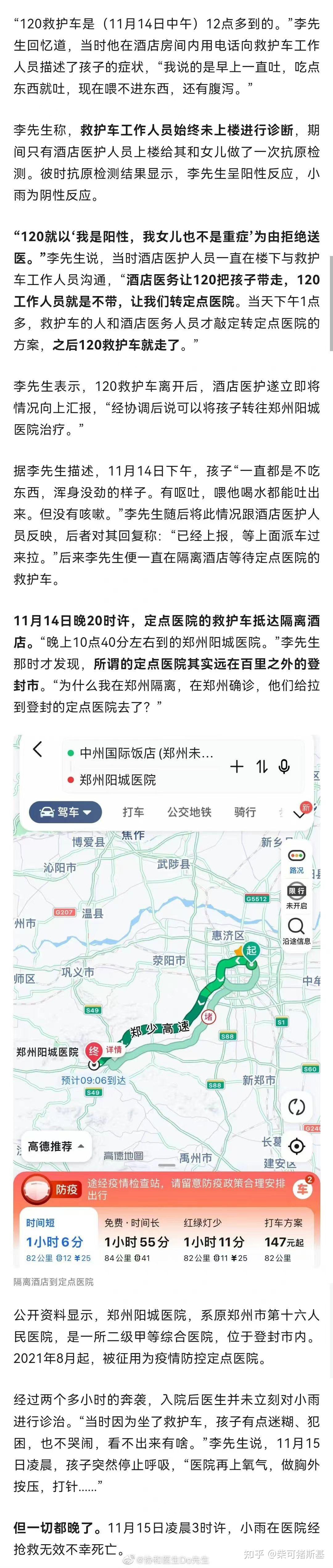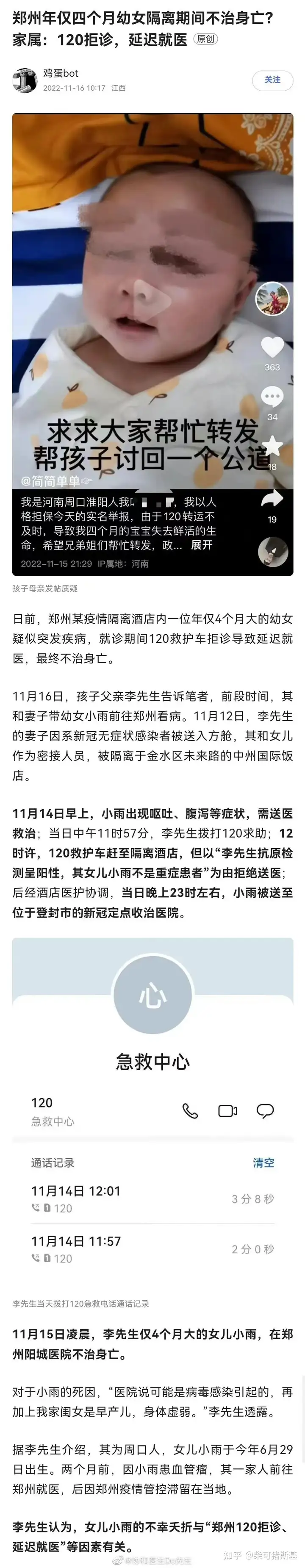 4个月的女婴病重,父亲中午11点57打120,120来了以父亲阳性、女婴非重症不救,反复折腾后,11个小时候后被转运到100多公里的登封医院。