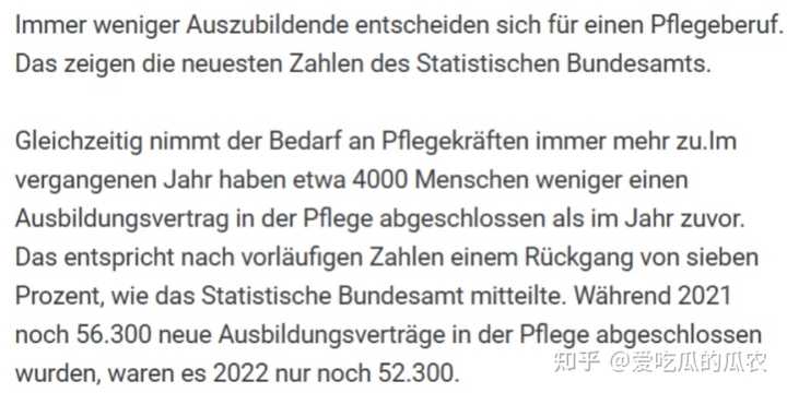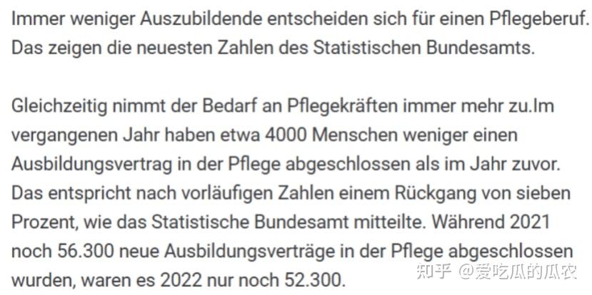 护理类职业在德国的需求缺口十分巨大。但根据德国联邦统计局的最新数据,仅由于人口老龄化,到2055年德国需要护理的人数将增加37%。到2035年,可能已经有560万人需要护理,这相当于比2021年底增加了14%。但另一方面,根据联邦统计局报告的初步数据,虽然2021 年签订了 56,300 份新的护理培训合同,但到 2022 年只有 52,300 份。