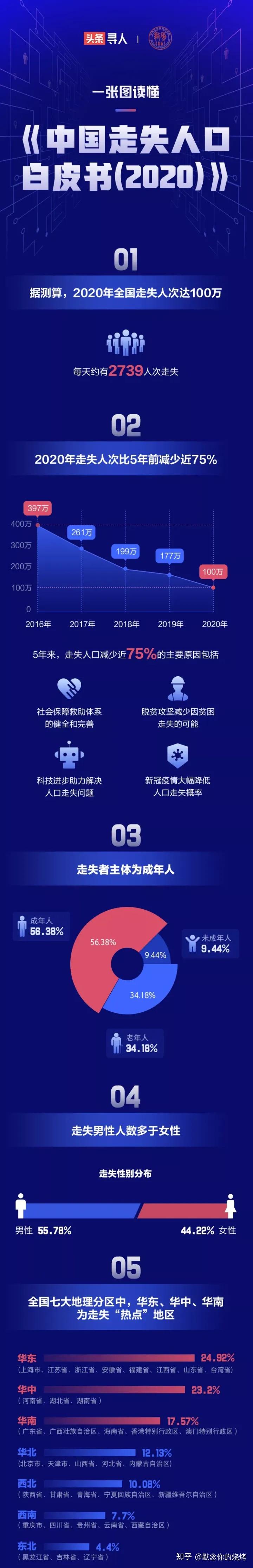 让我们根据事实说话。首先,2020 年全国每天约有2739 人次走失,全年走失达100 万人次。^①所以最近走失这么多人不是最近才这样的,只是媒体没有报道 你没有关注。