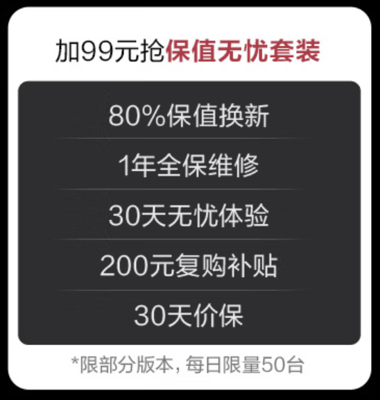80% 保值换新,就是在购机一年内,下代新品发布 2 月内,用户可以将旧机,以 80% 的保值率,进行抵扣换新。