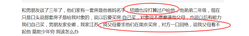 男朋友个人能达到你的预期,你可以想办法说服自己的父母降低要求,男朋友个人达不到你的预期,你可以选择离开,而不是“你这个人就不上进,想娶我必须有保障”为由榨干他爹妈的钱包