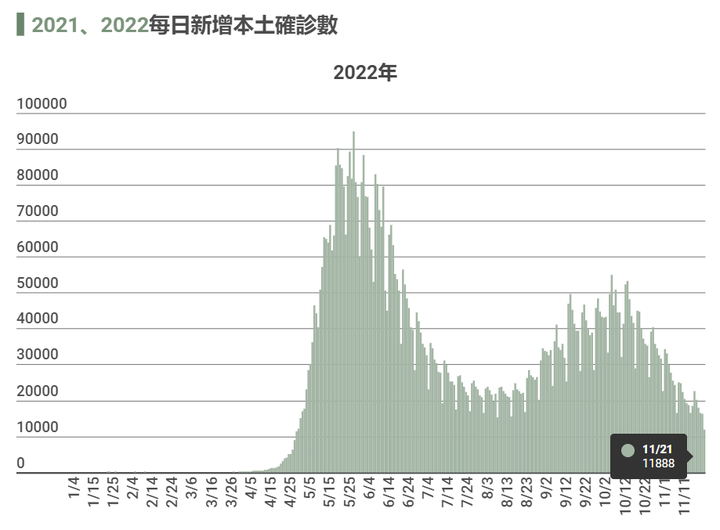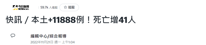 11 月 21日中国台湾新增本土新冠确诊病例 11888例,死亡 41 例