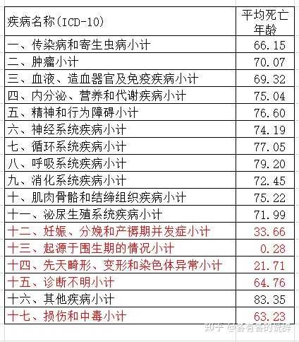 再来算下不同疾病的死亡者平均年龄,依据的是中国台湾地区的人口结构。