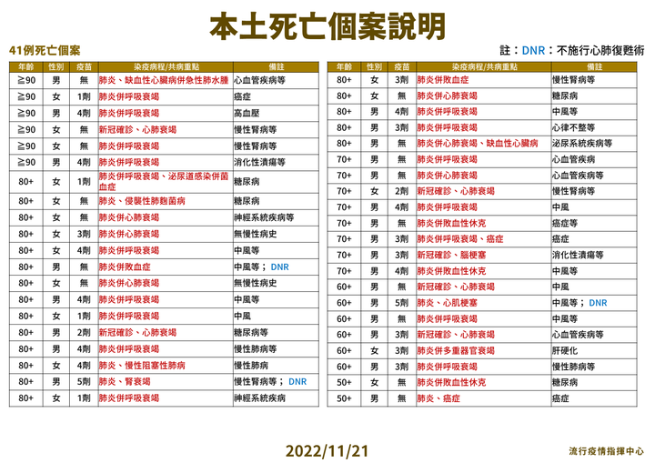 新增41例本土死亡,年龄介于50多岁至90多岁以上,22例未接种3剂以上COVID-19疫苗。确诊日于10月11日至11月18日,死亡于10月18日至11月18日。