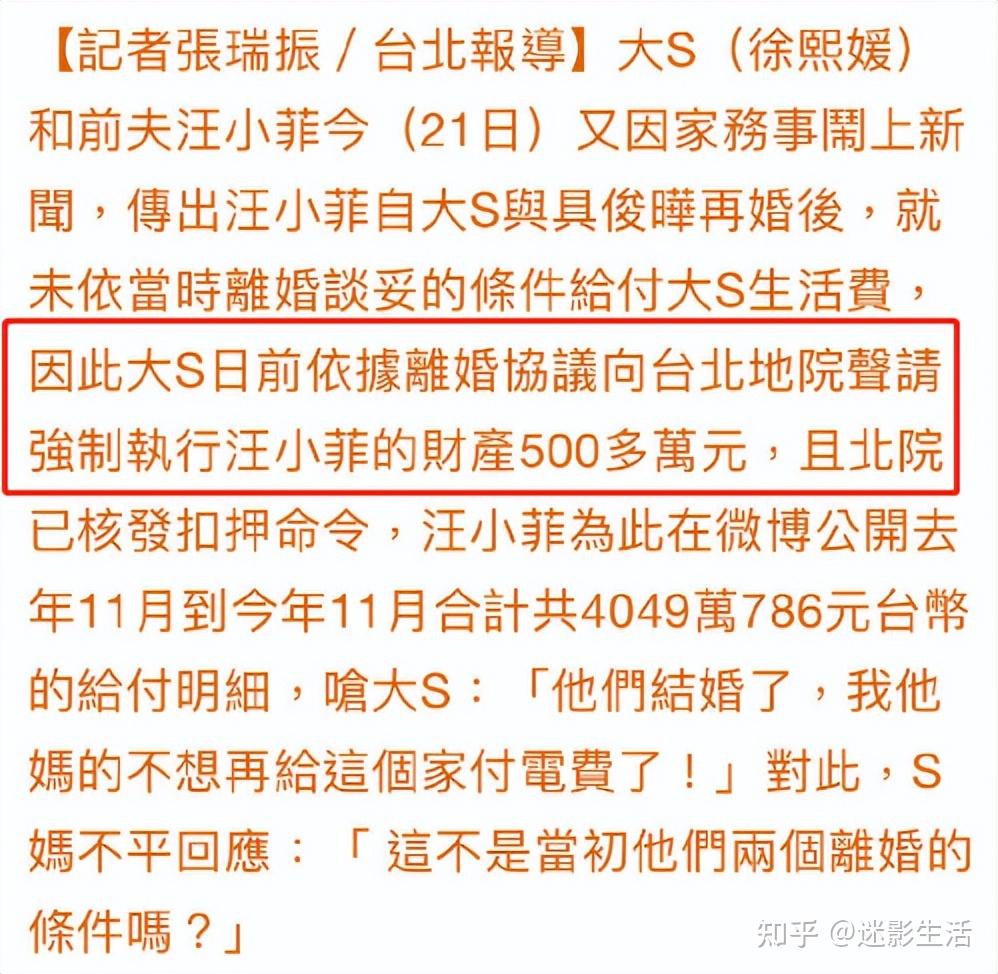 台媒爆料称,大S起诉汪小菲未履行离婚协议,自她与具俊晔再婚后,就不再付生活费。