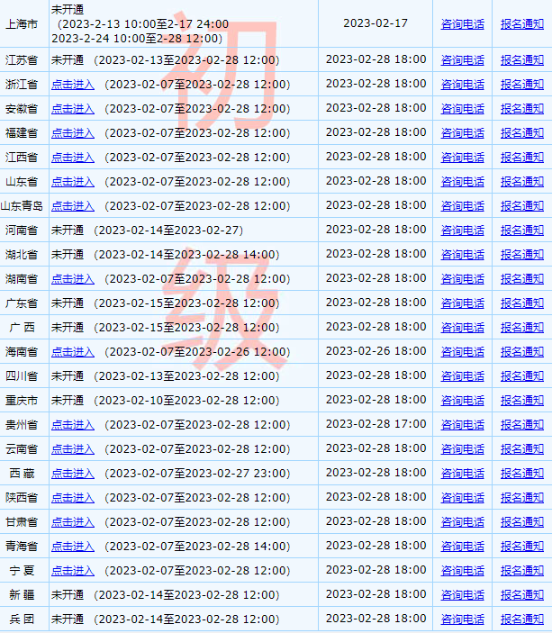 2023年2月28日报名截止地区:北京、天津、浙江、山西、山东、湖南、安徽、甘肃、宁夏、黑龙江、内蒙古、云南、贵州、福建、辽宁、江西、西藏、吉林、青海、重庆、河北、江苏、四川、湖北、新疆、兵团、广东、广西、上海 (第二阶段报名结束)