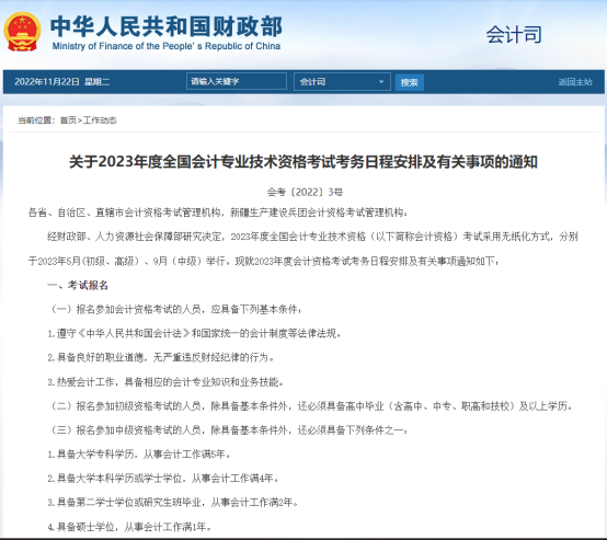 2022年11月22日晚,财政部会计司发布《关于2023年度全国会计专业技术资格考试考务日程安排及有关事项的通知》,初级、中级、高级报名时间均延后,其中中级报名时间延后3个多月!以上变动需要相关考生高度重视。