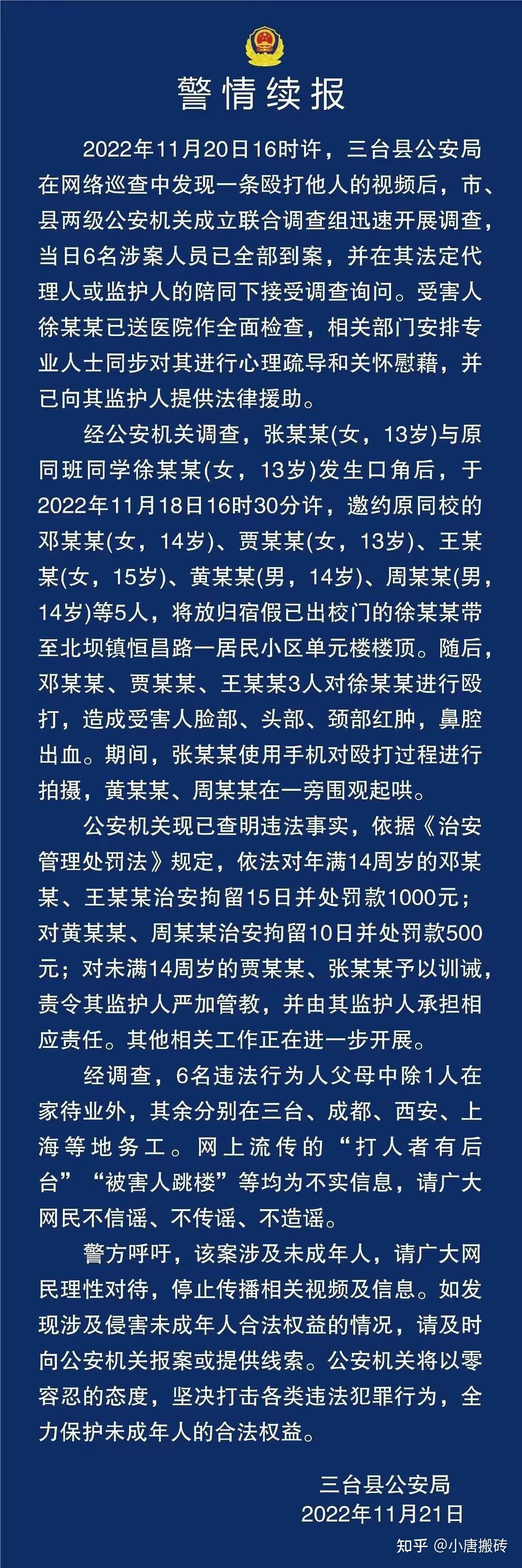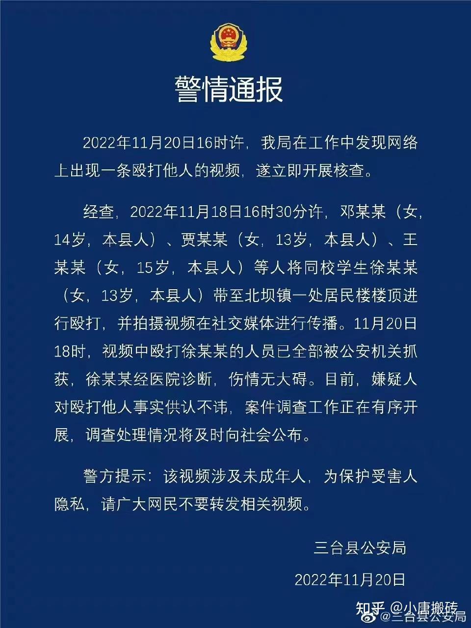 警方通告最下方专门备注了,该视频涉及未成年人,为保护受害人隐私,请广大网友不要转发相关视频。