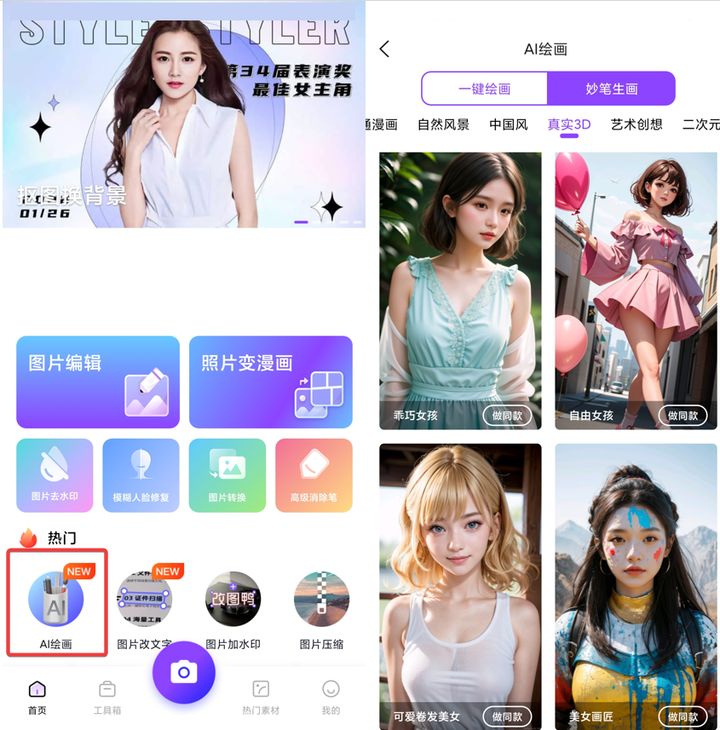 一个超级丰富的图片编辑APP,不仅支持用来编辑各种图片文字、去水印、裁剪,还提供了强大的AI绘画功能,打开首页就能看到需要的“AI绘画”功能,并且还提供了丰富好看的图片模型。
