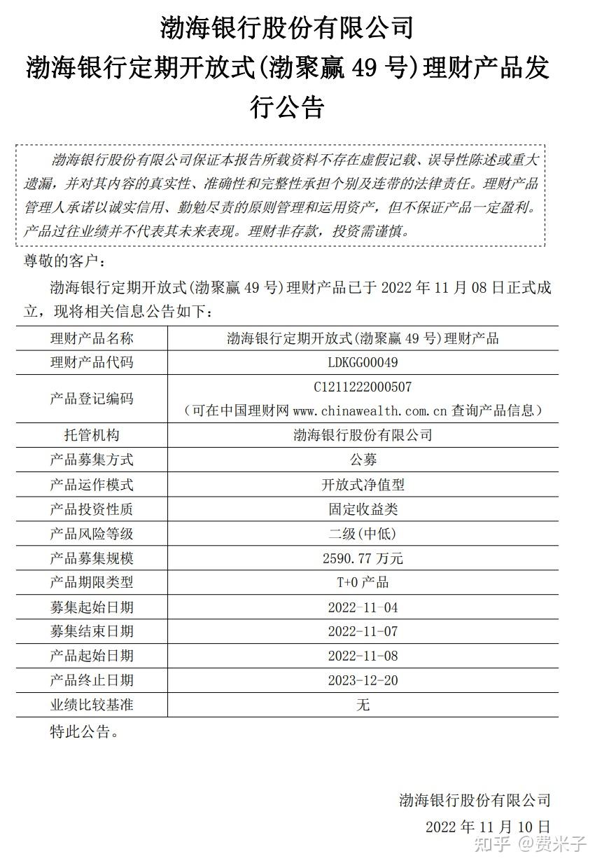 因为我没买过这款产品,也不是渤海银行的客户,所以只能网上搜索产品相关信息,这款产品的信息很少,只搜到一个产品成立公告(如图)。根据公告信息,该产品是2022年11月8日新成立的,运行还不满一个月。你看到的-7.41%是年化收益率,我估计应该是短期出现了小幅亏损,因为运行时间短,折算成年化收益率,亏损就被放大了。