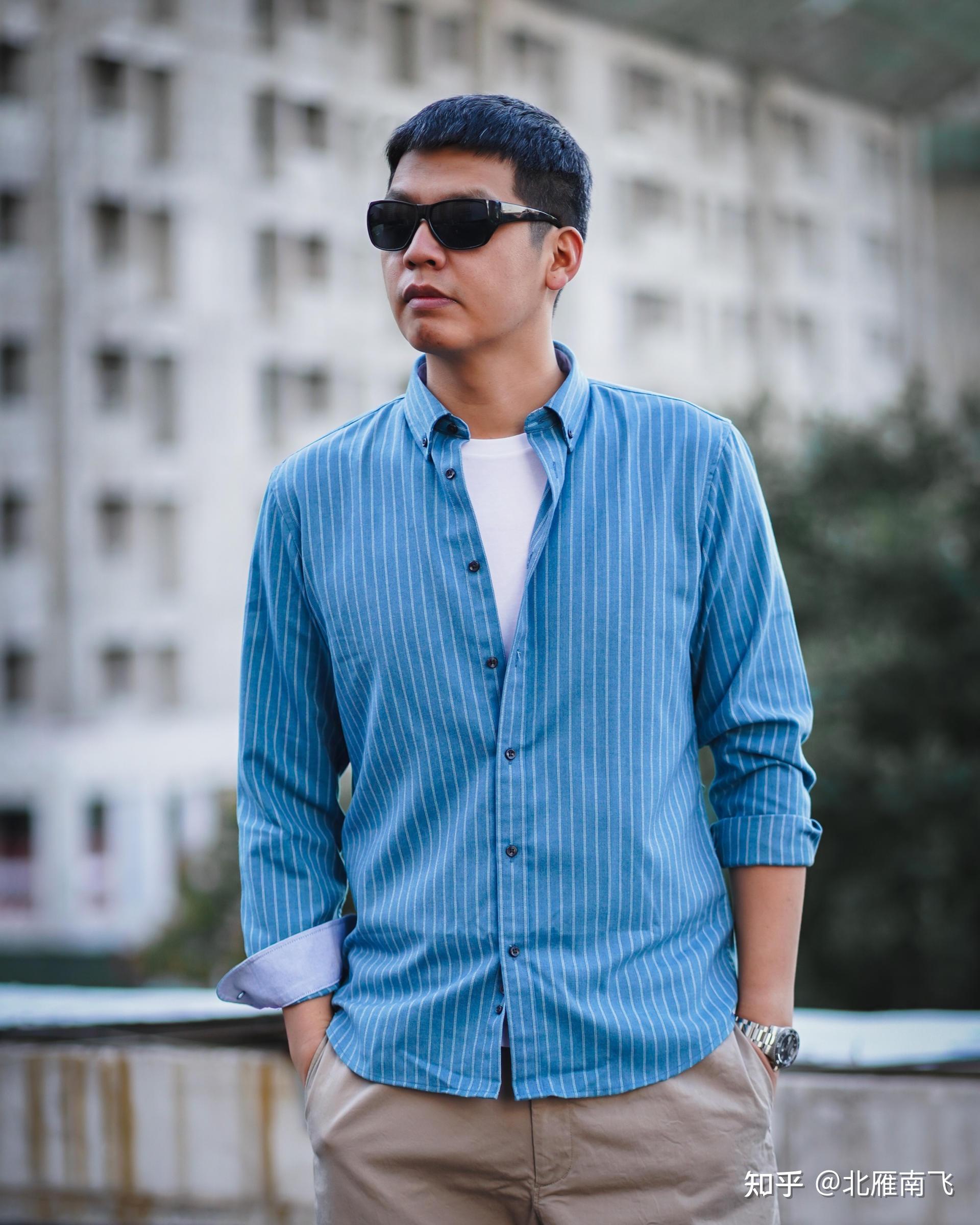这件衬衣整体有点复古的感觉,纽扣领、细条纹很有特点,衣领背后还有黑白红织带做装饰细节满满,古蓝色与锡灰色都很好看。衬衣材质为68.5%涤纶31.5%粘纤,厚度适中材质柔软,通过磨毛处理上身很舒服,领口与袖口内侧会缝有牛津纺面料定型。