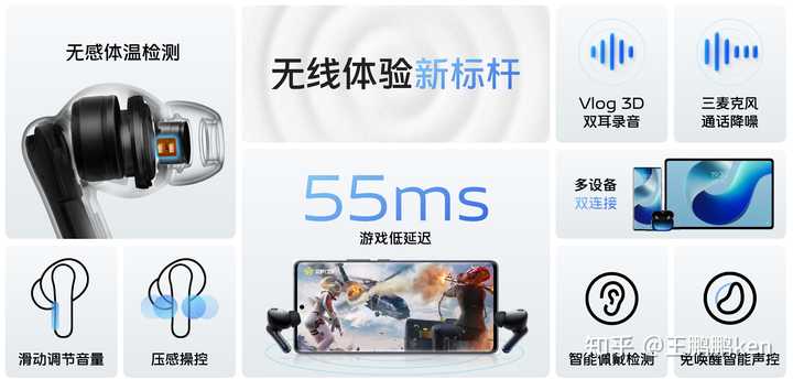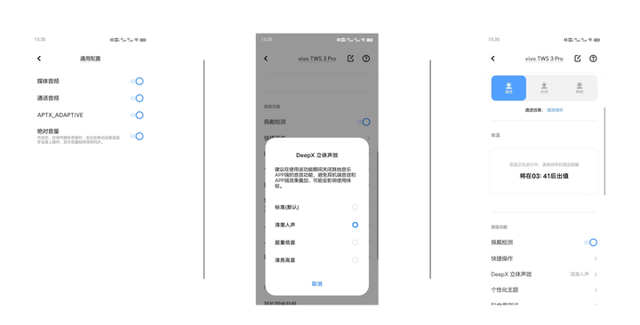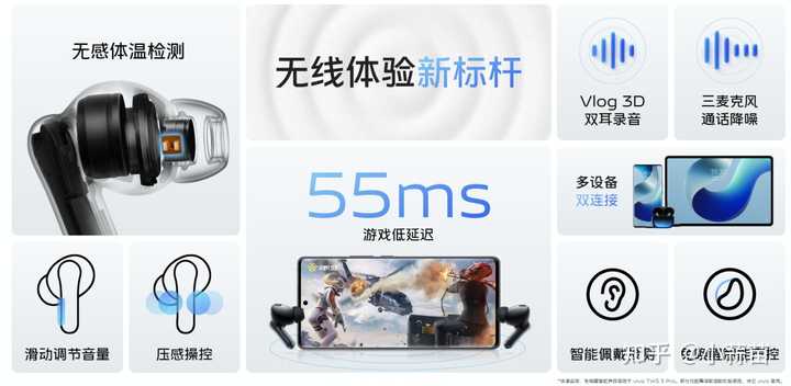 在3.5mm时代,蓝厂专长在DAC和放大器领域,XPlay6使用的是ESS 9038Q2M和两枚独立的前置耳放芯片,后续的NEX和X系列,蓝厂依然保持了CS43131的搭载传统。纵观整个行业,一直坚持在解码和功放环节下功夫的也就剩下vivo了。蓝牙TWS的链路更复杂,毕竟有线耳机不涉及到传输带宽问题,而Jitter是耳机爱好者绕不过去的山。在台式DAC上,为了降低抖动,电源,USB异步时钟都需要下功夫。而在TWS上,干扰音质传输的问题更多,蓝牙的编解码芯片本身就是个很大的问题。不过还好天玑9200和骁龙8 Gen2的蓝牙都做了技术更新,在X90 Pro+上率先实现了CD级(44.1KHz采样率,16bit量化精度)的无损传输,其传输码率为1.2Mbps,远超过320Kbps的MP3音质。需要强调一点,这是CD级别的无损音质,而不是蓝光级别的192KHz/24bit,后者需要更大的传输带宽,这需要更强劲的蓝牙芯片做支撑。最后是关于单元的,一般人耳朵只能听到20-20kHz的频响范围,这次单元的频响范围远超过人耳能感知的动态范围。TWS 3 Pro我已经在使用了,听取Spotify上的无损音乐,打开降噪的情况下,音质也非常好,中频让我印象深刻,人声非常甜美,相对Airpods Pro2,TWS 3 Pro的风格更鲜明,更适合深度听音使用。以王菲的《如愿》为例,空间感较好,王菲声音清晰且有力量,低频鼓点相对vivo以前的耳机量比较重,乐器组合的定位和结像力都很清晰,是一款听感很有特色的产品。TWS 3 Pro还支持耳温测量,配备了耳温传感器,四分钟左右出测试结果。