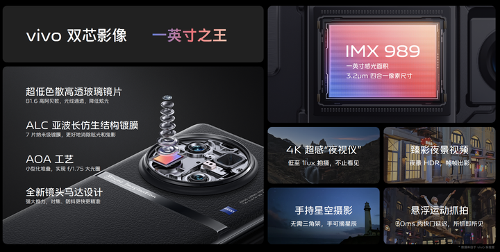 对于一个影像手机来说,传感器的尺寸和性能直接决定了它能在单位时间里获取多少原始信息,并且传递给NPU进行处理。这次X90系列使用了索尼IMX989 1英寸传感器及1/1.5英寸VCS大底传感器结合自研的V2处理器。V2芯片在之前的技术沟通会上提及过,它配备全新自研的MEMC、AI NR、HDR Tone Mapping等算法,可大幅提升图像原始信息的实时 AI 降噪与 HDR 融合效果。