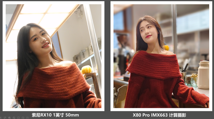 回到人像的话题,我们再看两张图,这是1英寸的索尼RX10在50mm焦段和X80 Pro 1/2.7的IMX663在同焦段直出对比: