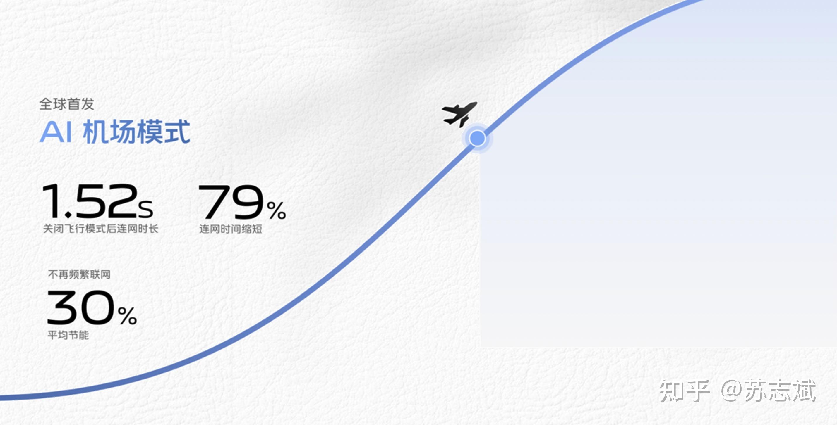 这个模式包含两个部分,一是识别你是否到达了机场,并根据你的飞行起降状态调整手机的搜网策略来减少飞行途中的搜网能耗,延长电池的续航,可节约三分之一的电量;二是基于航线和起降状态的判断,在关闭飞行模式后重新捕获网络的速度可以从 7.4 秒提升到 1.5 秒,几乎是落地的瞬间就重新回到了在网状态。