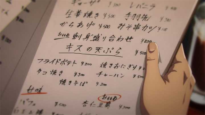 漫画没画菜单内容显得有点突兀,动画增加了自己的理解,看到那个“キスの天妇罗”没,还记得这一集标题叫什么?