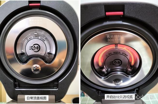 功能特色:旋风防溢微压阀+四大米种,三大快捷键(快煮,柴火饭和煮粥),煲仔饭,杂粮饭,各种炖、蒸、做菜等功能采用了上盖远红外穿透加热+底部IH加热的上下夹攻方式,合计1450W的大火力,打开顶盖后,可以直观的看到玻璃内罩中的一圈远红外发热丝,采用的是航空级全真空材质的碳纤维发热管,整个顶盖科技感十足。