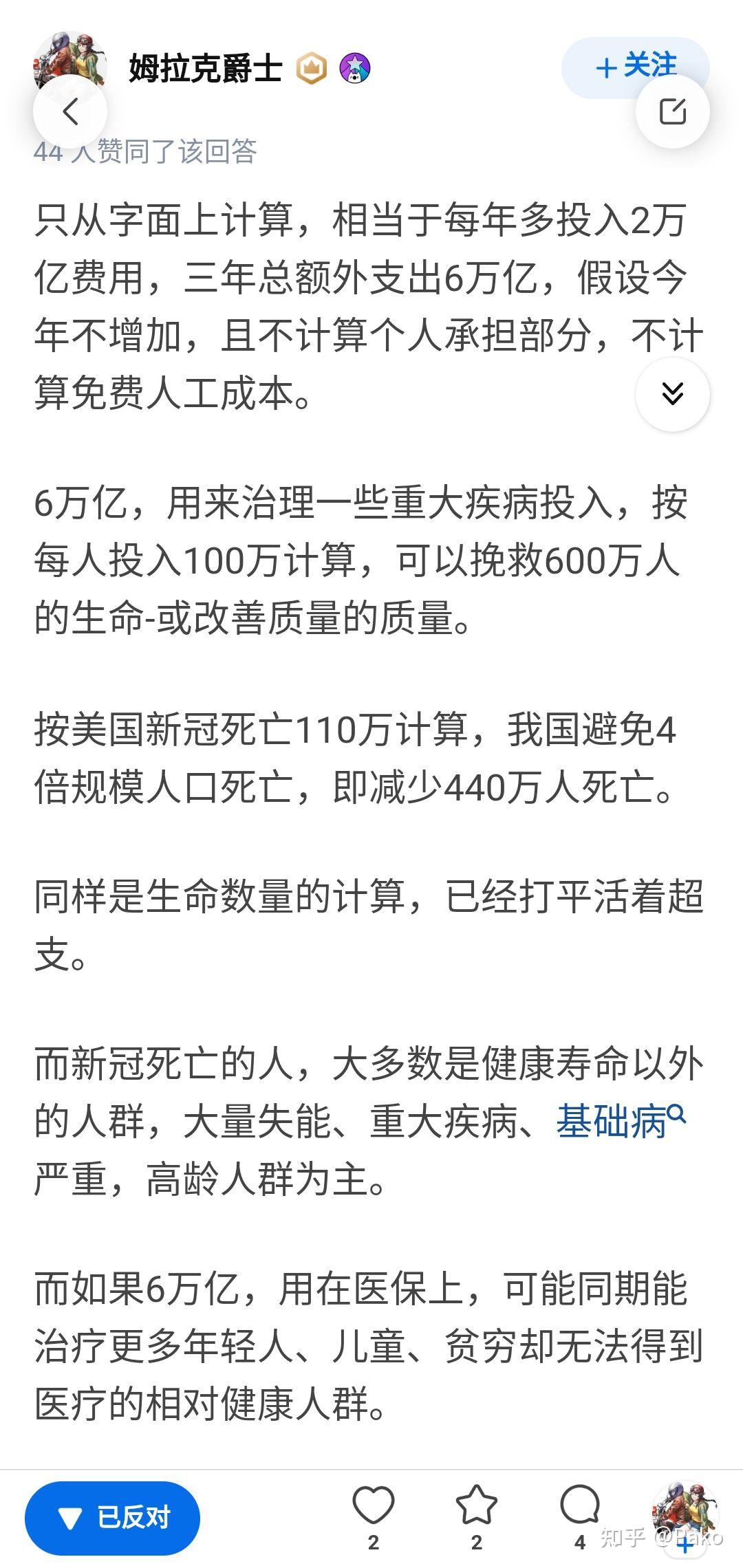就图里这种先把自己前后逻辑理清楚再说好吧,前半说钱省下来治疗重大疾病,后半又说重大疾病可以死,治疗的是相对健康的人,合着重大疾病患者在你这里就是个工具呗,需要的时候是人命,不需要的时候是乐色?另外,放开感染,治疗新冠和长新冠的钱又怎么算?中国没有美国那么多的医疗资源,医疗挤兑造成的死亡人数不可能按照美国的死亡人数比例计算,多死的人又怎么算? 发布于 2022-11-23 18:53・IP 属地浙江 赞同 24添加评论分享 收藏喜欢 收起