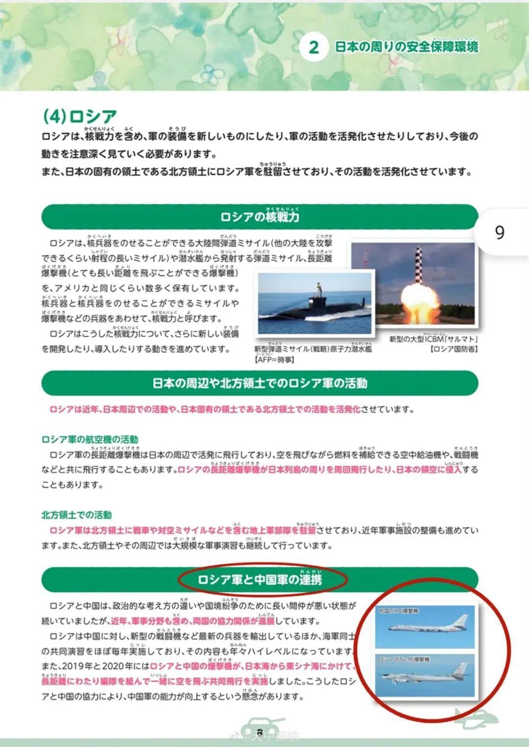今天,日本并没有放弃对中国的“恐惧”和“仇恨”,日本还有个“儿童版日本防卫白皮书”,提到最多的就是中国和“美日同盟”,频繁提到中国的大约是这么几条:1、中国军费多;2、中国的军机、军舰、潜艇常常到日本附近;3、南海争端,都是中国的错;4、美国是日本的保护伞,是爹,“美日同盟”万年长;5、孩子们,日本要加强军事装备,永远要小心中国......你看看日本是怎样教育孩子的?他们的下一代,在孩童阶段,就被告知“中国是威胁,中国是敌人”。