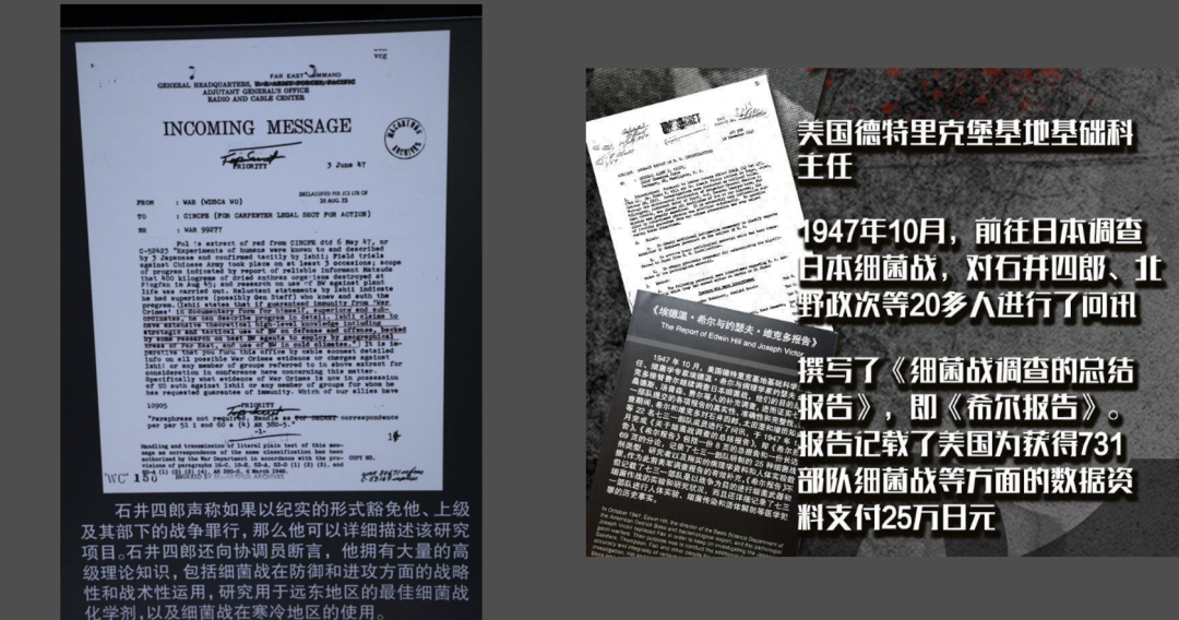 美国为了得到731部队细菌战数据资料,支付了25万日元。美国甚至向世界隐瞒石井四郎以及731部队的滔天罪行,还让石井四郎成为德特里克堡的生物武器顾问。