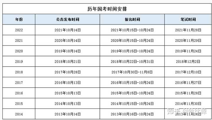 根据统计,历年国考的招考时间比较集中,10月中旬发布公告,一周左右完成报名,再11月下旬举行笔试