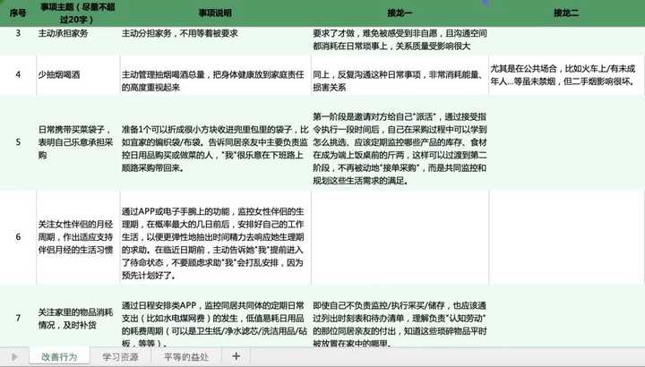 我自己的生活,也有一些细节上的改变。在这个群里,还列出了一份「男性现代化清单」,里面有诸如「主动承担家务」、「日常携带买菜袋子,表明自己乐意承担采购」、「关注女性伴侣的月经周期」、「注意家里的物品消耗情况,及时补货」之类的要求,我都会努力做到。