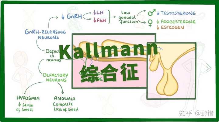说人话:卡尔曼在男性和女性均有发病,具体表现为:第二性征不发育,无嗅觉或嗅觉弱,伴随着基因突变。