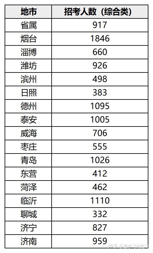 从人数上来看,近两年综合类考试统考招录人数比较稳定,整体在12000以上,个别地市青岛、烟台、临沂、德州等基本过千。