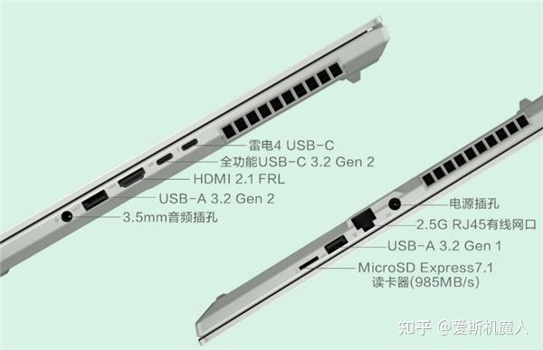 接口也齐全,有蓝牙5.2,两个全功能USB-C接口,支持PD充电,HDMI2.1接口。