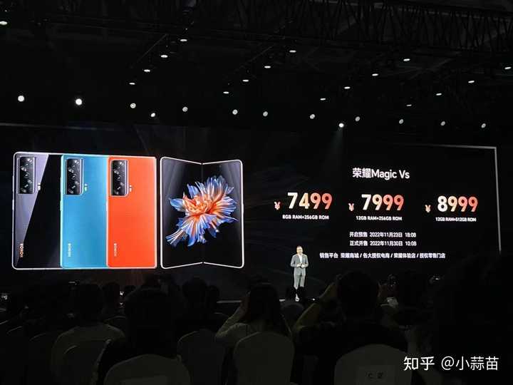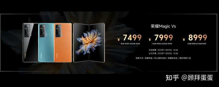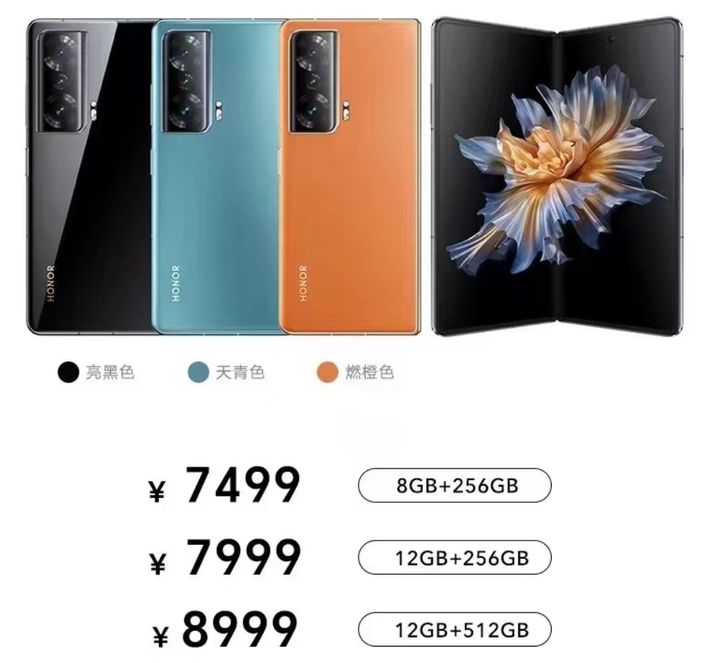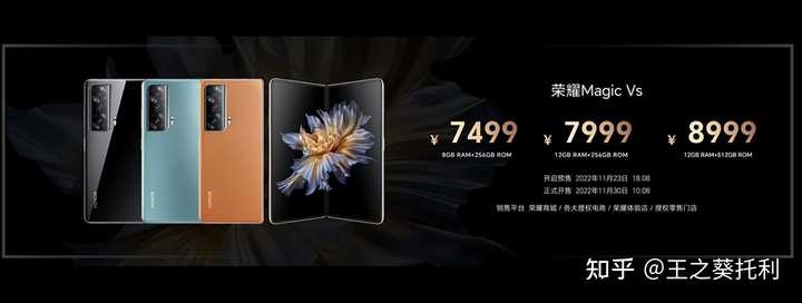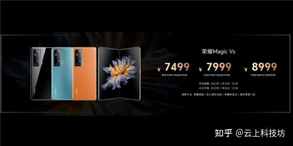 荣耀Magic Vs 折叠屏手机今天正式发布。售价方面,标准版:8 + 256 G 的 7499 元,12 + 256 G 的 7999 元,12 + 512 ...
