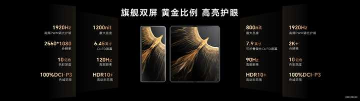 Magic Vs外屏6.45寸OLED,2560x1080分辨率、120Hz刷新率,最高亮度1200尼特,内部展开是7.9英寸OLED 2K屏,分辨率2272x1984,90Hz刷新率,内外双屏均支持HDR10+高动态范围、覆盖100% DCI-P3色域、1920Hz PWM高频护眼调光等。