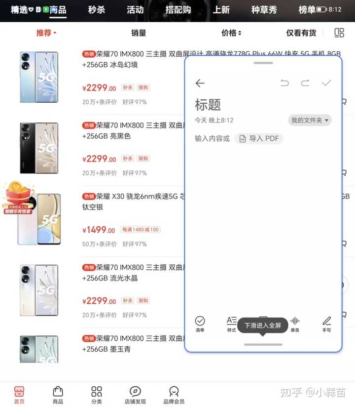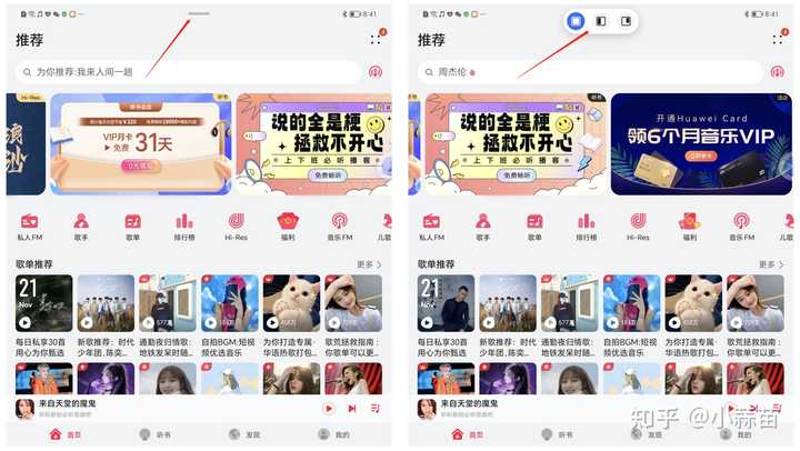 在这里有一个很有意思的点,是分屏或者悬浮屏的进入逻辑。一个是荣耀在应用顶部有一个导航栏,点击既可进入全屏、分屏和悬浮窗的选择按钮界面: