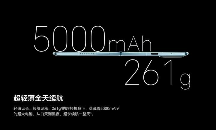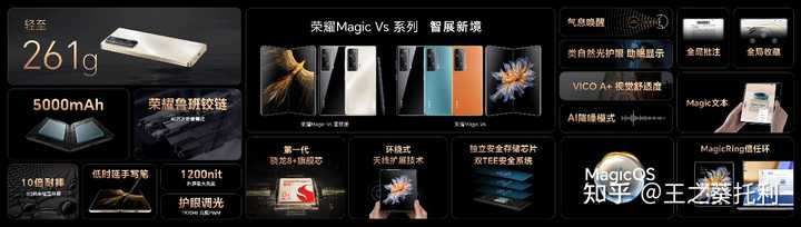 荣耀Magic Vs做到了现有对开折叠屏手机里重量最轻(素皮后壳版,261克)、电池容量最大(5000mAh)。